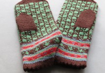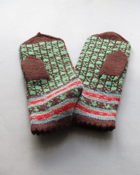 Kumštinės, lygaus mezgimo pirštinės, raštuotos, naminės vilnos. Plaštakos dekoruotos eilėmis su žalsvais žiedelių-langelių ornamentais bei mėlynomis ir raudonomis linijomis rudame dugne. Įmautės kraštai profiliuoti pusapvaliais dantukais.
