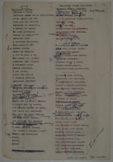 Верш “Дом” Ларысы Антонаўны Геніюш набраны на пішучай машынцы са значнымі праўкамі, што зроблены сінім, чорным і чырвоным стрыжнямі. Унізе подпіс аўтаркі. Дом (назва верша) Падвезьлі машыны/цагліны і блокі/ забегалі людзі ля іх мітусьліва, /устае дзень пры дні/новы дом пад аблокі,/ дарослым на радасьць, /а дзецям на дзіва! /бы звер, эскаватар/стаіць на паляне — /магутная сіла/ у суставах жалезных, /бярэ, падымае/ Ён лапамі кранаў/цяжар за цяжарам/ і пот не цячэ з іх./ Тут праца, як гульні/скрыпіць сабе толькі/і гойдаюць краны/цяжары нестомна,/а дом устае,/ устае пад аблокі/і хочацца мальцам/пастроіць падобны! Далей прадстаўлены яшчэ чатыры вершы, якія таксама набраны на пішучай машынцы.