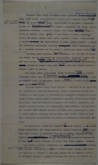 Машынапісны варыянт прадстаўлены на 3 аркушах, на беларускай мове. Першы ліст пазначаны як 5-ы, склеены з 4-ох частак. Другая і трэцяя старонкі пазначаны нумарамі 40 і 41, склеены. На кожным аркушы ёсць праўкі, зробленыя фламастэрам і ручкай шарыкавай. На адваротным баку зроблены надпіс: “пачатак 5 га раздзела са “Знака бяды” ”. Аповесць “Знак бяды” (1982) стала адметнай ў творчасці пісьменніка. У сваім творы аўтар зрабіў спробу глыбей прааналізаваць падзеі нядаўняй гісторыі — вайны і сталінскай калектывізацыі, супаставіць іх уплыў на лёсы людзей. У аповесці лірычныя старонкі, поўныя замілавання сваім краем і ягоным людам перакрыжоўваюцца з апісаннем трагічных падзеяў, якія прыйшлі з усходу і захаду разам з чужынцамі. “Некалькі дзён запар восеньскае неба грувастка цежалела ад аблокаў, дужа ірваў вецер, заходзячы то з аднаго, то з другога боку, а пасля уначы пацямнела і ўсё сціхла, пад ранак пасыпаўся дождж…”. У 1986 г. аповесць была адзначана Ленінскай прэміяй.