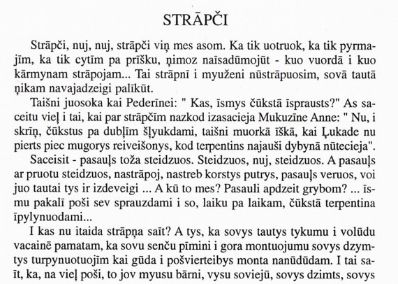Tieši A. Slišāns ir bijis viens no produktīvākajiem autoriem, kas ir veidojis jaunvārdus, izmantojot sakni strāp-, šajā gadījumā strāpuot ‘steigties’ un strāpnis ‘steiga’. Rakstnieks vairākkārt savos publicistiskajos tēlojumos kategoriski iestājas pret mūsdienu dzīves straujo tempu, ko diktē civilizācija, pilsētvide (mīškuons).