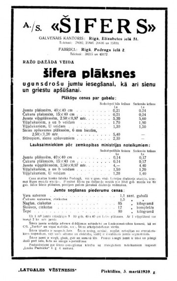 1935. g. oktobrī Reigā darbu uzsāka Valsts šīfera fabrika. 20. gs. 30. gados Latvijas prese plaši atspoguļoja šifera ražošanu, raksturojot to kā rūpniecības sasniegumu. Taču realitātē ugunsgrēku gadījumos šifera jumti dega, skaļi sprakstēdami.